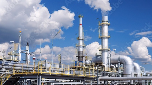 Industrial natural gas processing plant with towering storage tanks, pipelines, and compression units under a clear sky