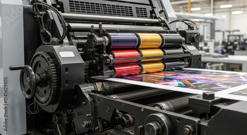 Industrial offset printing press in operation, producing colorful prints in a factory.