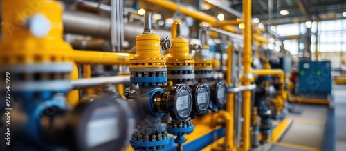 Industrial Pipeline System with Pressure Gauges and Valves in a Modern Factory Setting
