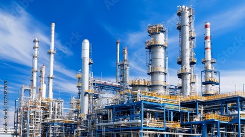 Industrial plant with tall structures against a blue sky and wispy clouds, showcasing technology in action