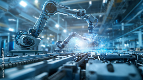 Industrial robot arm on factory conveyor belt. 3d rendering