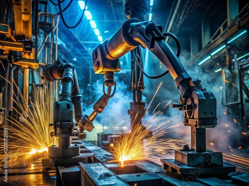 Industrial Robot Welding at Night: Precision Metalwork in Factory Setting