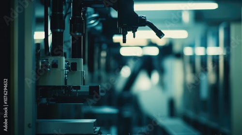 Industrial robotics in a modern manufacturing facility showcasing intricate machinery and automated systems working synchronously in a dimly lit environment