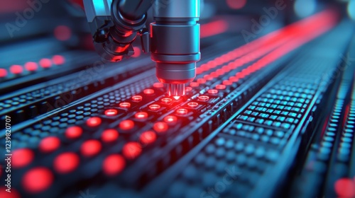 Industrial Robots Equipped with Precision Laser Tools Working in a Futuristic Fabrication Workshop or Factory Setting Advanced Automation Electronics and Machinery Concept