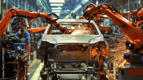 Industrial robots welding a car body on an automated assembly line.