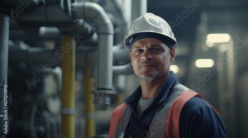 Industrial Savvy: Portrait of a Middle-Aged Heavy Industry Engineer Amongst Workers and Machinery in a Chemical Plant.