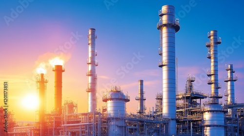 Industrial scene with smokestacks and sunset, showcasing energy production.