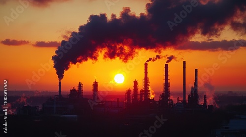Industrial skyline at sunset with smoke and pollution rising into the sky.