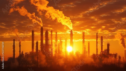 Industrial skyline at sunset with smoke stacks silhouetted against a vibrant sky