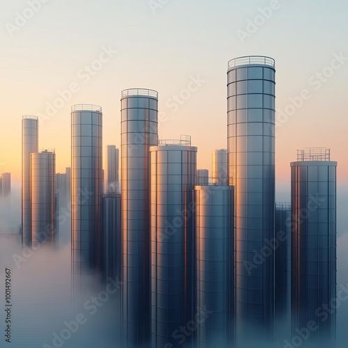 Industrial skyline, cloaked in ambient fog, metallic structures, 3D illustration