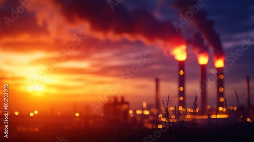 Industrial smokestacks against a vibrant sunset, depicting pollution and energy.