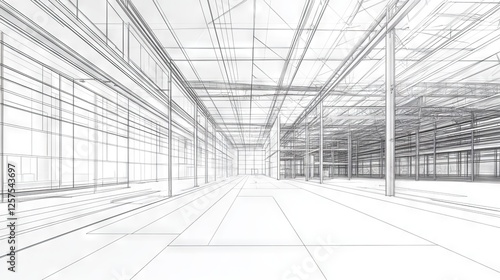 industrial structure visualization, architectural line rendering, warehouse framework design, technical building sketch, structural perspective drawing, detailed interior illustration, linear