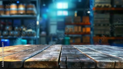 Industrial warehouse backdrop with soft bokeh lights, featuring a clear empty table surface, perfect for showcasing products or emphasizing industrial aesthetics.