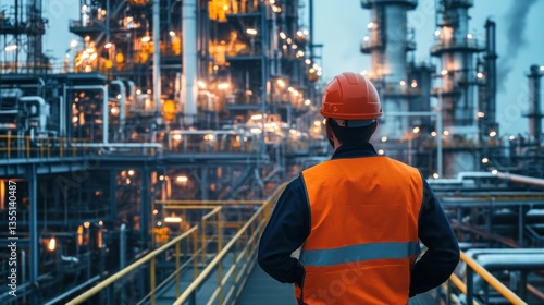 Industrial Worker Contemplating Refinery Complex at Dusk