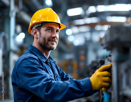 Industrial Worker Examining Machinery in Factory Setting A Focused Portrait of a Male Industrial Worker in a Factory Environment