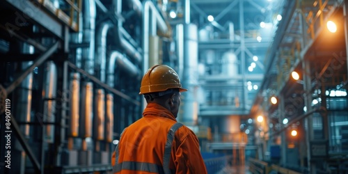 Industrial worker in a hard hat, observing machinery in a manufacturing factory, highlighting industrial work environments.