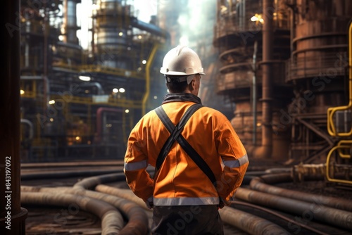 Industrial worker in safety gear surveys a large factory with heavy machinery and piping in the background. Worker ensures safe operation.