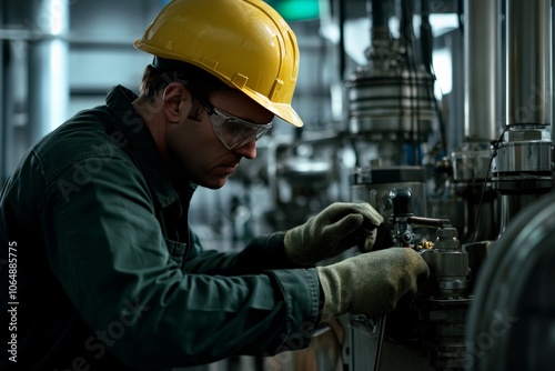 Industrial worker wearing hard hat and safety gear while adjusting machinery in factory setting, occupational safety concept