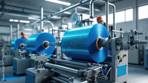 Industrial workers operate large machinery processing bright blue rolls of plastic film in a modern factory setting.