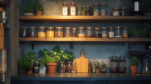 Industrial-style kitchen corner with dark floating shelves and subtle concealed lighting, highlighting organized glass jars and a selection of small plants for a rugged yet refreshing ambiance.