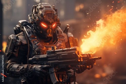 Inferno Guardian: Futuristic Robot Warrior Emerges from the Flames, Armed with Advanced Technology.
