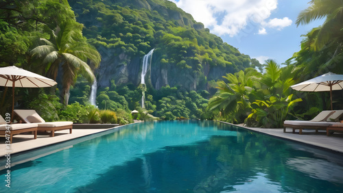 Infinity pool overlooking waterfall in luxurious tropical resort