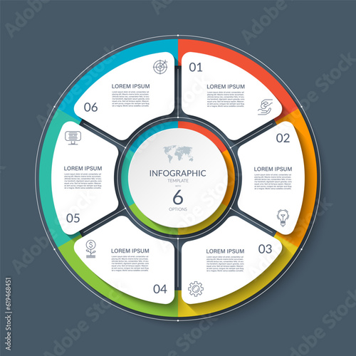 Infographic circle with 6 options, parts. 6-step cycle diagram for business infographics. Process chart, vector template for presentation, report, brochure, web, data visualization.
