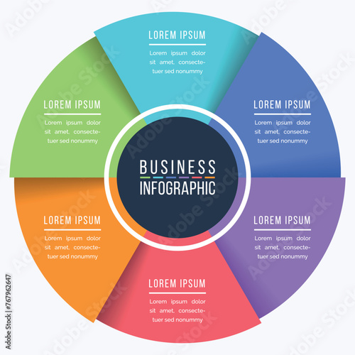 Infographic design circle 6 steps, objects, options or elements business information colored