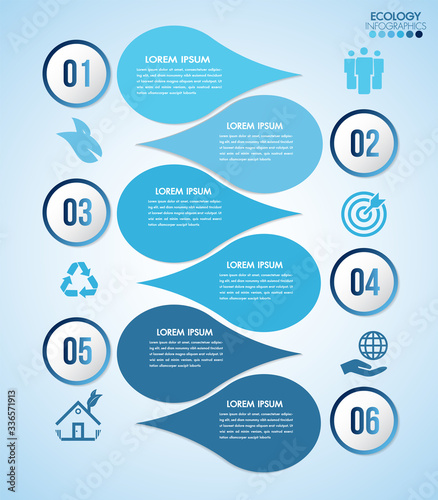 Infographic eco water blue design elements process 6 steps or options parts with drop of water. Ecology organic nature vector business template for presentation.