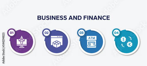 infographic element template with business and finance filled icons such as rocket launch monitor, web package, atm card, currency rates vector.