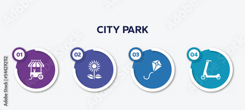 infographic element template with city park filled icons such as ice cream cart, sunflowers, kite, scooter vector.