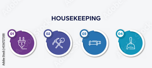 infographic element template with housekeeping outline icons such as electrical plug, mine, hacksaw with handle, dustpan vector.
