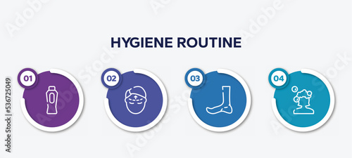 infographic element template with hygiene routine outline icons such as baby powder, forehead, ankle, hair wash vector.