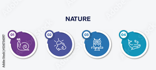 infographic element template with nature outline icons such as snail, clouds and sun, owl, whale vector.