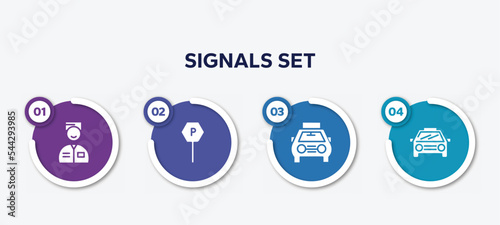 infographic element template with signals set filled icons such as valet, parking, solar taxi, car frontal view vector.