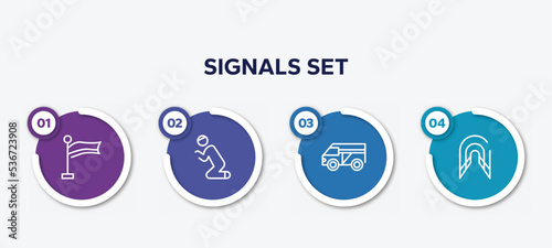 infographic element template with signals set outline icons such as plain flag, praying, minivan taxi, tunnel vector.