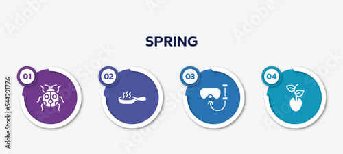 infographic element template with spring filled icons such as ladybird, pan, snorkel, seeds vector.
