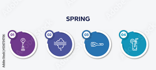 infographic element template with spring outline icons such as , glacier, flashlight, lemonade vector.