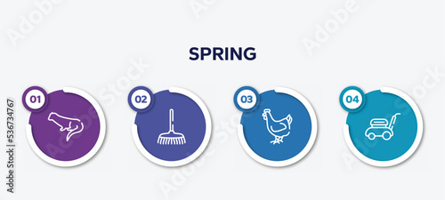 infographic element template with spring outline icons such as otter, rake, hen, lawn mower vector.