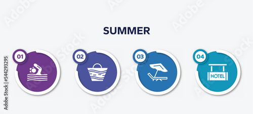 infographic element template with summer filled icons such as swimming person, beach bag, beach chair, hotel hanging vector.