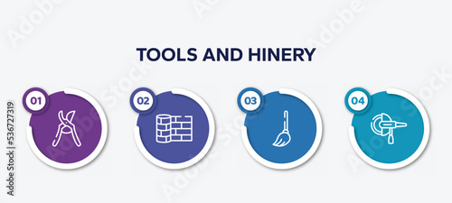 infographic element template with tools and hinery outline icons such as pruning shears, linoleum, mop, grinder hine vector.