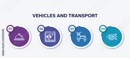 infographic element template with vehicles and transport outline icons such as covered food plate, vacation images, sidecar, blimp vector.