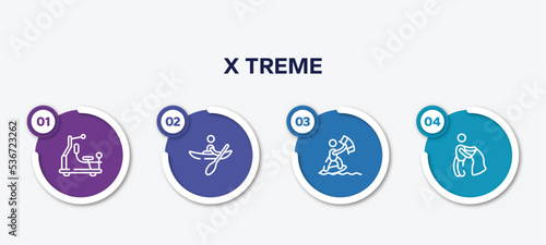 infographic element template with x treme outline icons such as gym station, kayaking, kitesurfing, bullfight vector.