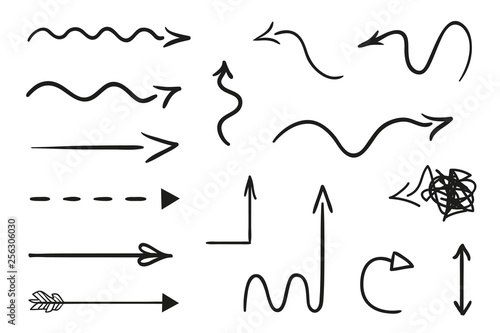 Infographic elements on isolated white background. Hand drawn simple arrows. Line art. Set of different pointers. Abstract indicators. Black and white illustration. Doodles for artwork
