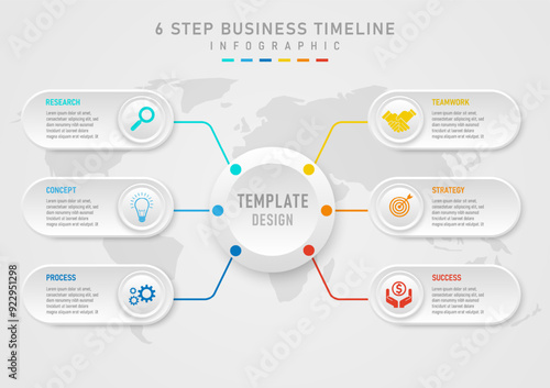 infographic template 6 steps to business planning for success. The left and right gray square buttons have text on top and the gray button with an icon in the middle below has a map.