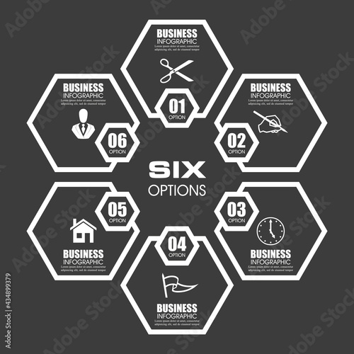 Information infographic statistic vector presentation. Graphic composition for your business presentations. Six hexahedron label for your annotations. 6 hexagon sticker for registration of proposals