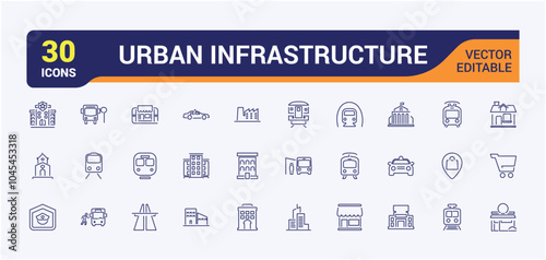 Infrastructure icon pack. Contains such icons as urban, skyscraper, construction, development, building, community and more. Simple icon designs. Editable stroke. Vector illustration.