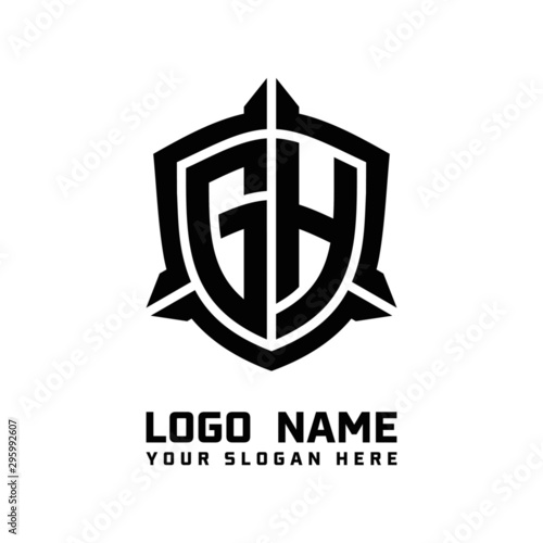 initial GH letter with shield style logo template vector. shield shape black monogram logo