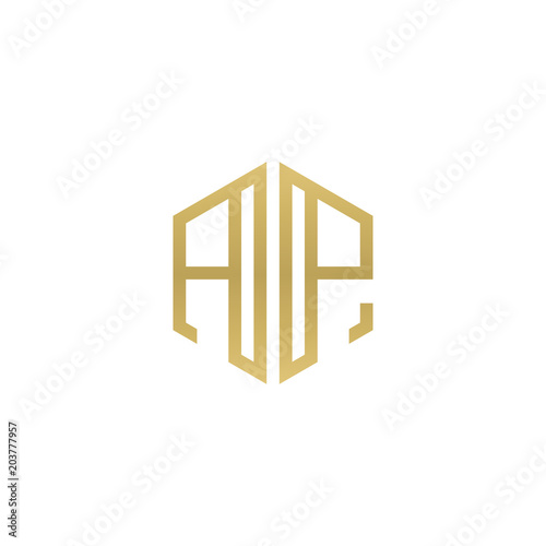 Initial letter AP, minimalist line art hexagon shape logo, gold color