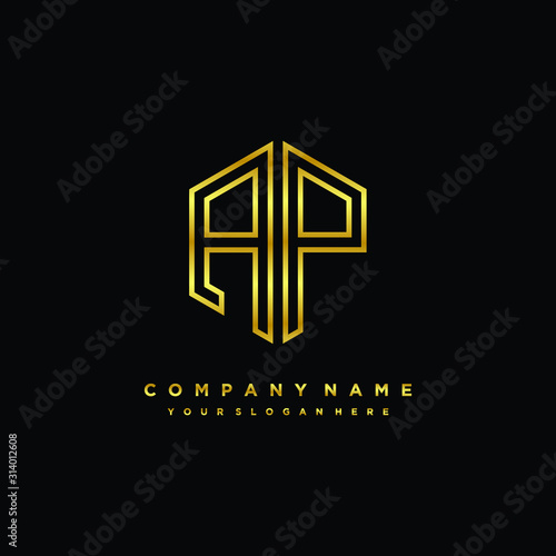 Initial letter AP, minimalist line art monogram hexagon logo, gold color